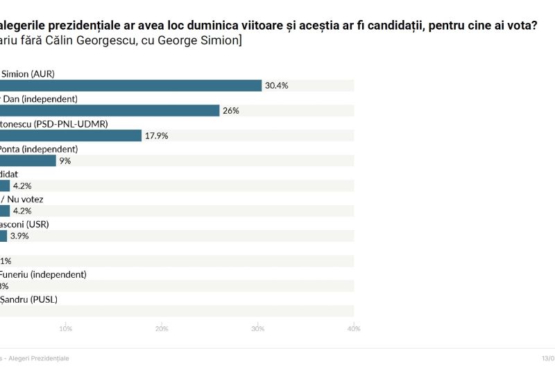 Potrivit sondajului, în primul tur, George Simion ar obține 30.4% din voturi, urmat de actualul primar general al Capitalei, Nicușor Dan, cu 26% și de candidatul comun al PSD-PNL-UDMR, Crin Antonescu, cotat cu 17.9%.