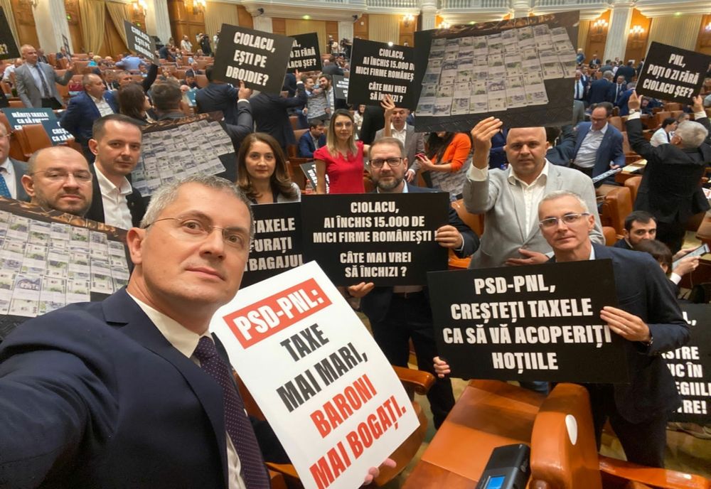 Vicepreşedintele USR a dat declaraţia în faţa sălii de plen a Camerei Deputaţilor, pe fundal remarcându-se mai multe pancarte purtate de parlamentari ai partidului, cu texte precum: "PSD - PNL, creşteţi taxele ca să vă acoperiţi hoţiile"; "Măriţi taxele ca să furaţi cu portbagajul" sau "PSD - PNL, taxele noastre se duc în privilegiile voastre".